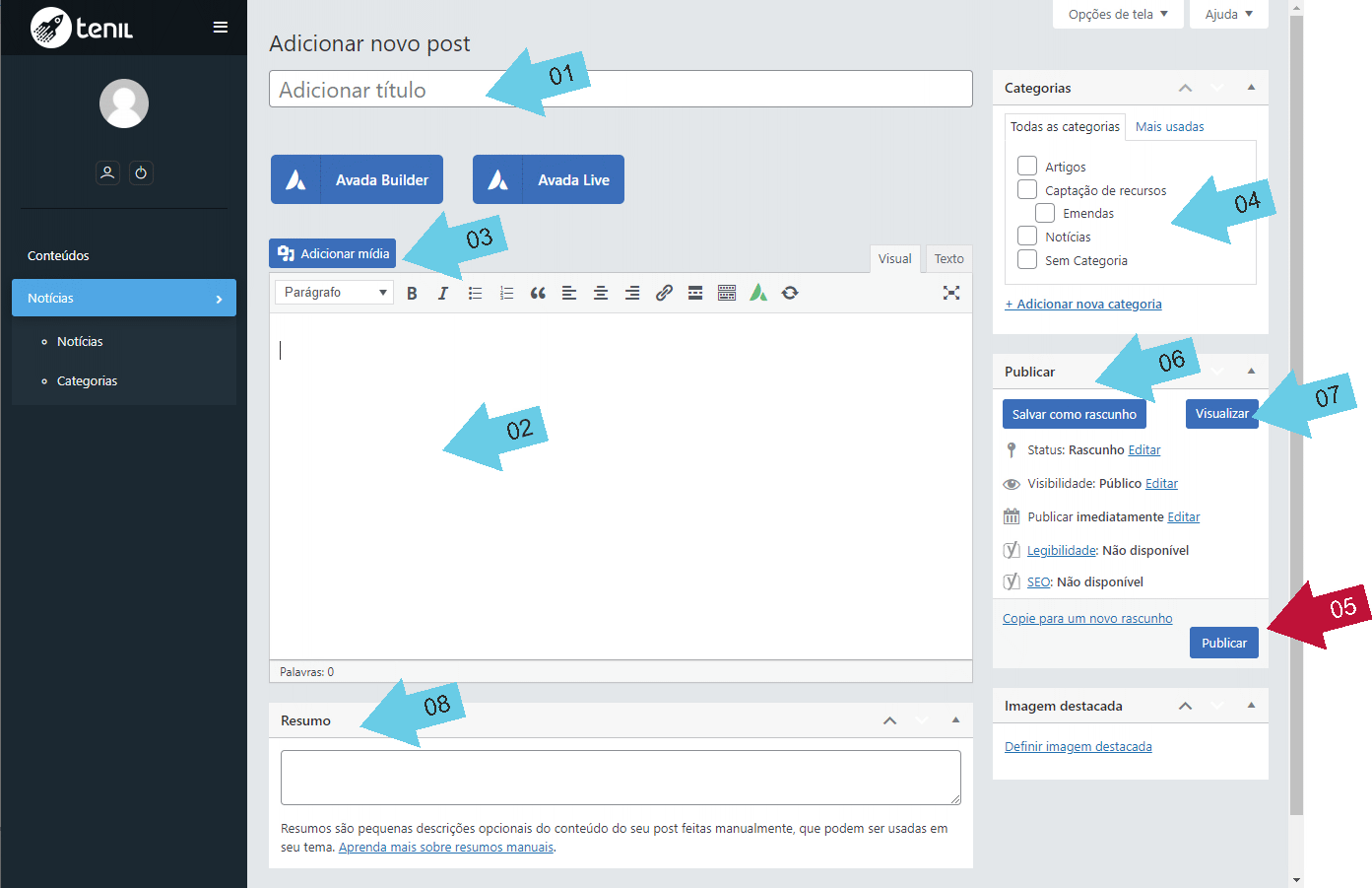 - Selecione a categoria em que este post se encaixa (seta 04). Mais de uma categoria poder ser selecionada.