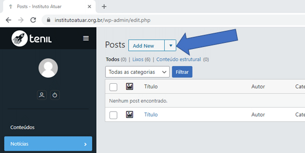 Para adicionar uma notícia clique no botão “Add New” que aparece no canto superior da tela.
